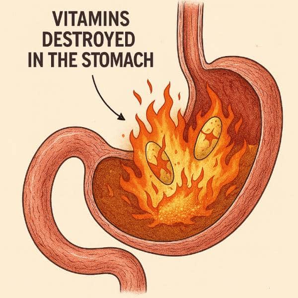 - Degradation by Stomach Acids: The stomach produces hydrochloric acid to break down food, which can also degrade many dietary supplements. Some vitamins, particularly water-soluble ones like vitamin C, can be partially destroyed in this acidic environment, reducing their effectiveness before they even reach the intestines.