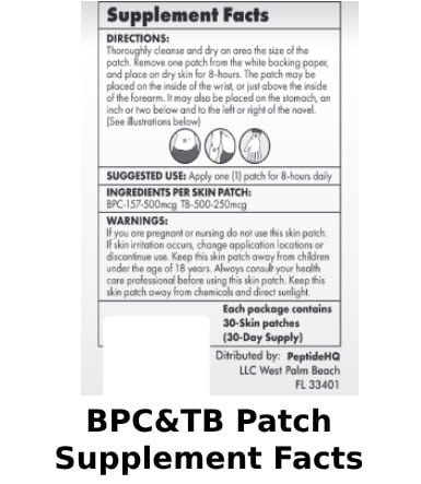 ExclusivePeptide HQ’s transdermal skin patch is an excellent way to administer the healing effects of BP-157 and TB-500. Simply place the small 2×2 patch on dry skin and forget about it. The recommended areas of application are on your stomach next to your navel, or the inside of your elbow/wrist. For the next 8 hours, the patch infuses the peptides into your skin.  Click to Learn More about BPC & TB Skin Patch Stack